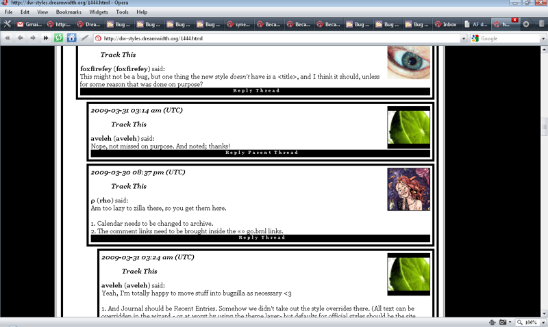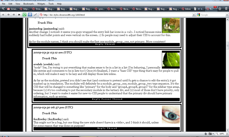 Please report any new issues through your usual bug-reporting channels. If you don't know what those are, feel free to comment to this entry! But first, check the list of open styles-related bugs and the list of all styles-related bugs. (Note: we still have some issues reported through comments that aren't in bugzilla. We'll be going through those and opening up bugs as appropriate, soon).